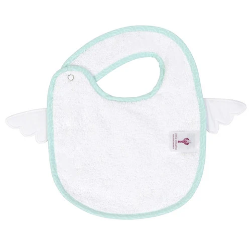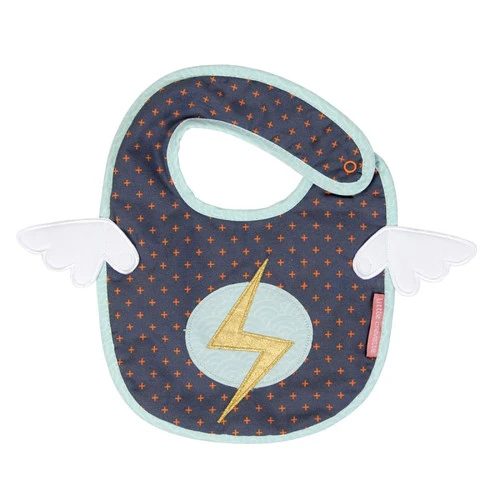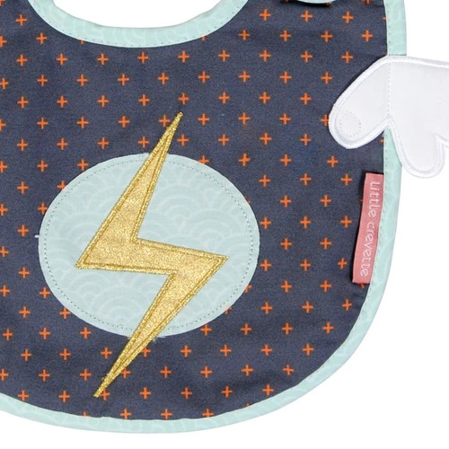 Bavoir de super bébé pour de super repas. Face avec la panoblie du super héro, l’éclair de feu, les ailes, le motif pour la classe. Le recto en éponge bien absorbante pour essuyer les bavouilles.