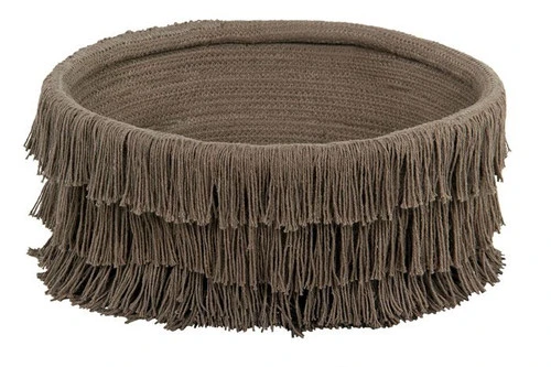 Panier rond en coton, en forme de nid d’oiseau, formant un bol, fabriquĂ© en couleur Marron Sol et fini Ă l’extĂ©rieur avec plusieurs rangĂ©es de franges en dĂ©sordre