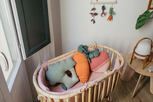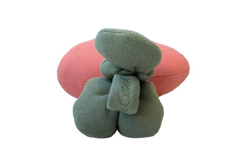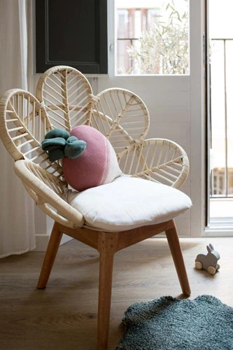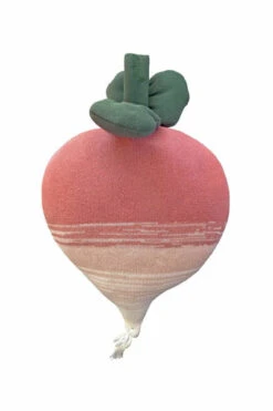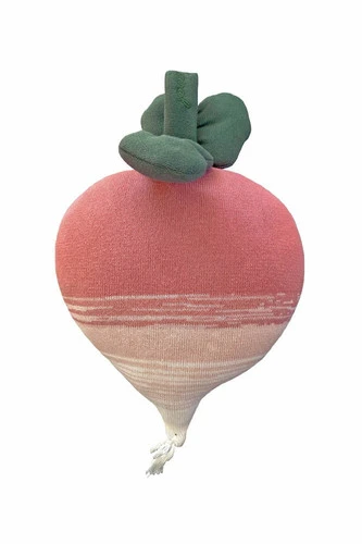 Un doux coussin en forme de radis tricoté dans des tons de coton rose et ivoire créant un effet ombré. Les feuilles vertes tricotées au sommet comportent une poignée qui permet de la suspendre ou de la transporter. En bas, une petite tresse faite à la main imite la racine du légume. Le rembourrage est composé de polyfill et l’ensemble du coussin est lavable en machine.