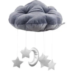 Un grand coussin Nuage rempli de ouate moelleuse hypoallergénique forme la base du mobile qui soutient une pluie d’étoiles et lune légèrement scintillantes.
