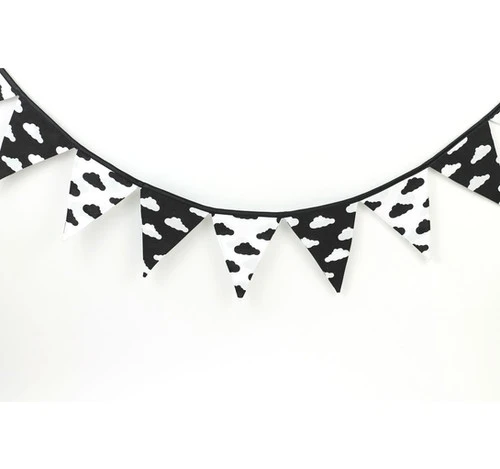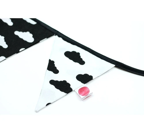 Guirlande de fanions doublés pour la décoration, avec 7 grands fanions en textile dans divers imprimés nuages.