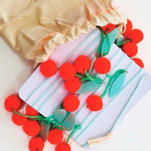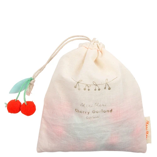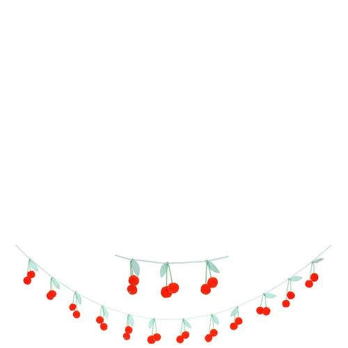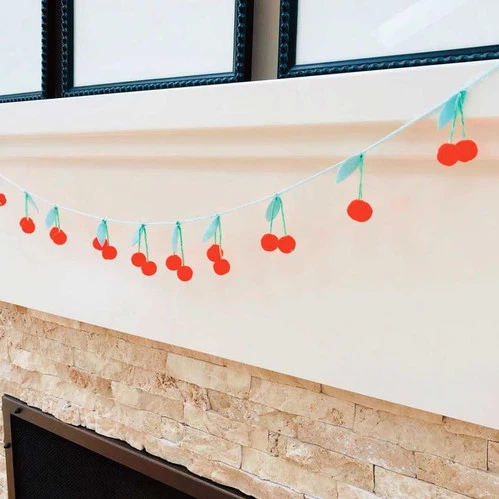 Chaque paire de pompons cerise est suspendue à une corde solide et accompagnée d’une feuille en tissu d’un joli vert.