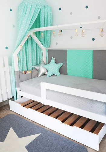 Son grand tiroir permettra le rangement du linge de lit, de jouets ou d’y glisser un matelas pour un couchage supplémentaire. Le fond du tiroir est un sommier à lattes.