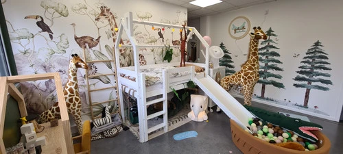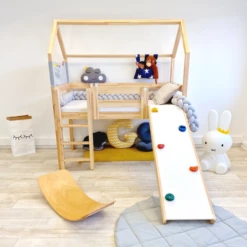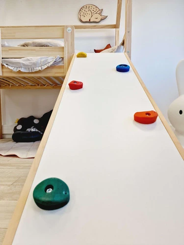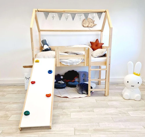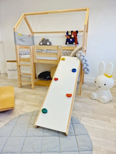 Une forme de cabane sur pilotis et un plan d’escalade pour les petits cascadeurs!
