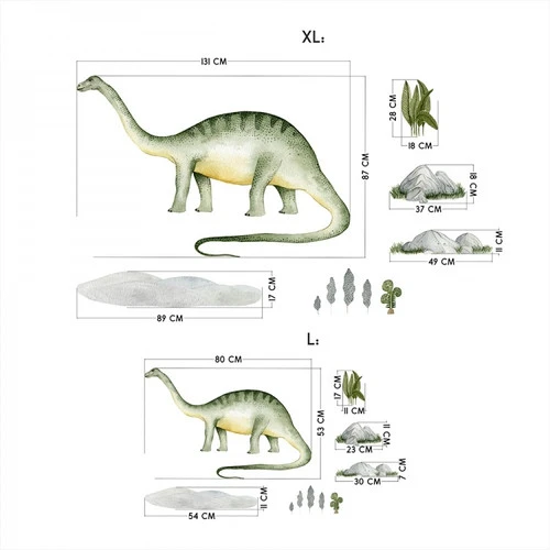 L’ensemble comprend un brontosaure monumental et plusieurs éléments rocheux et végétaux.