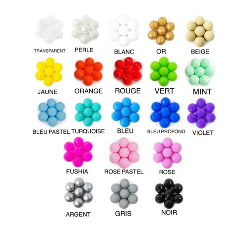Les balles que nous proposons sont disponibles en 21 couleurs, Vous avez donc la liberté de composer votre assortiment entre toutes les couleurs souhaités dans la limite de 250 balles et coloris différents.