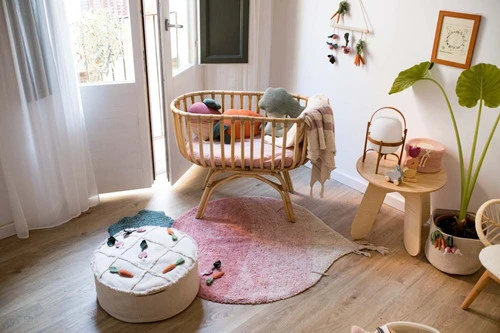 Ce pouf rond est fait à la main en toile de coton de couleur naturelle avec des franges capitonnées sur le dessus qui dessinent les lignes du jeu de société. Le pouf dissimule une petite poche de chaque côté où l’on peut ranger les mini-compteurs de légumes, dont 4 petites carottes et 4 radis. Une fermeture éclair à la base du pouf permet de retirer la housse pour la laver.