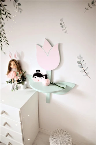 Magnifique décoration pour une chambre de fille. L’étagère est également idéale comme chevet près du lit.