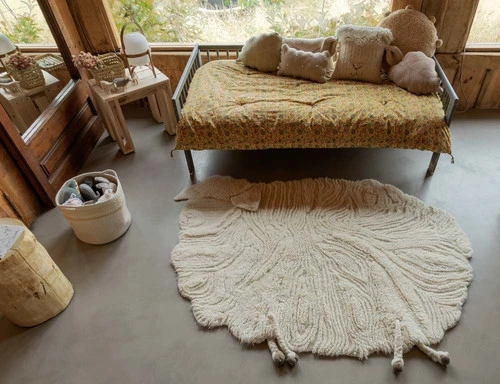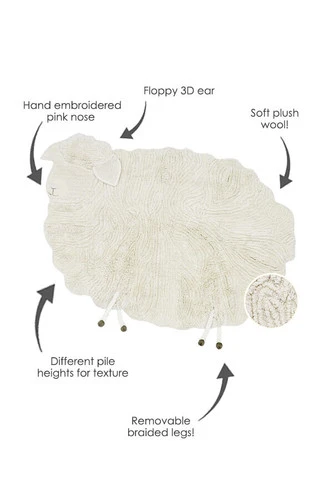 Le tapis Pink Nose Sheep a la forme d’un mouton duveteux. En combinant diffĂ©rentes hauteurs de poils, l’aspect laineux de l’animal est obtenu. Le tapis a des bords arrondis, soulignant la silhouette de la tĂŞte et des oreilles. Les tresses faites Ă la main forment des pieds amovibles, qui sont fixĂ©s Ă travers un Ĺ“illet Ă la surface du tapis et peuvent ĂŞtre facilement retirĂ©s pour le lavage.