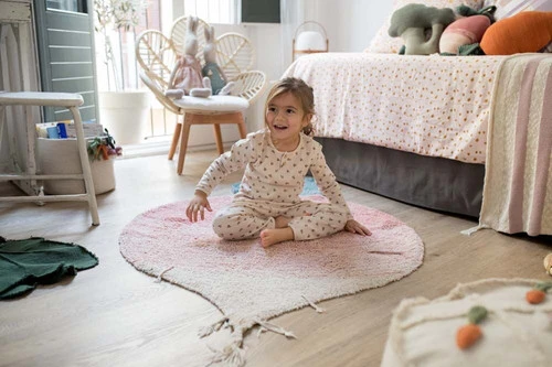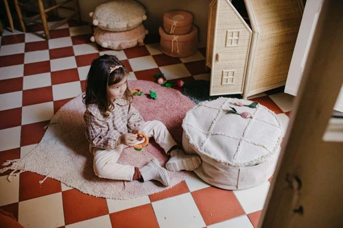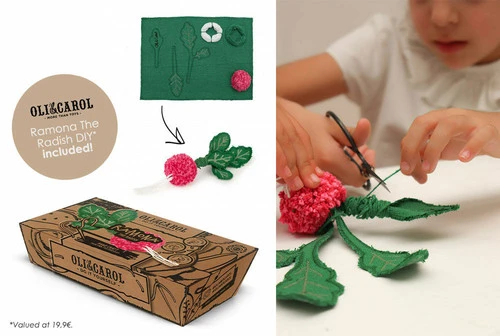 Il est livré avec une pochette à cordon contenant 15 morceaux de légumes en toile de coton fabriqués à la main, combinant des carottes, des radis et des feuilles de chou frisé. Ceux-ci peuvent être placés dans les poches du tapis pour faire semblant de jardiner. Le tout est emballé dans un sac fourre-tout en coton pratique et illustré qui sert également à ranger le tapis.
