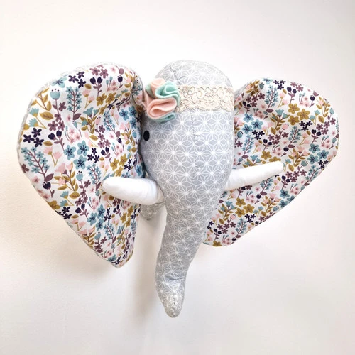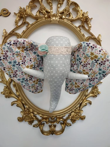 Les dimensions ( à titre indicatif ) : oreille à une autre 50 cm ,hauteur 40 cm du haut du crâne jusqu’à la trompe du bas.