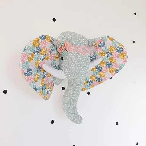 Les dimensions ( à titre indicatif ) : oreille à une autre 50 cm ,hauteur 40 cm du haut du crâne jusqu’à la trompe du bas.